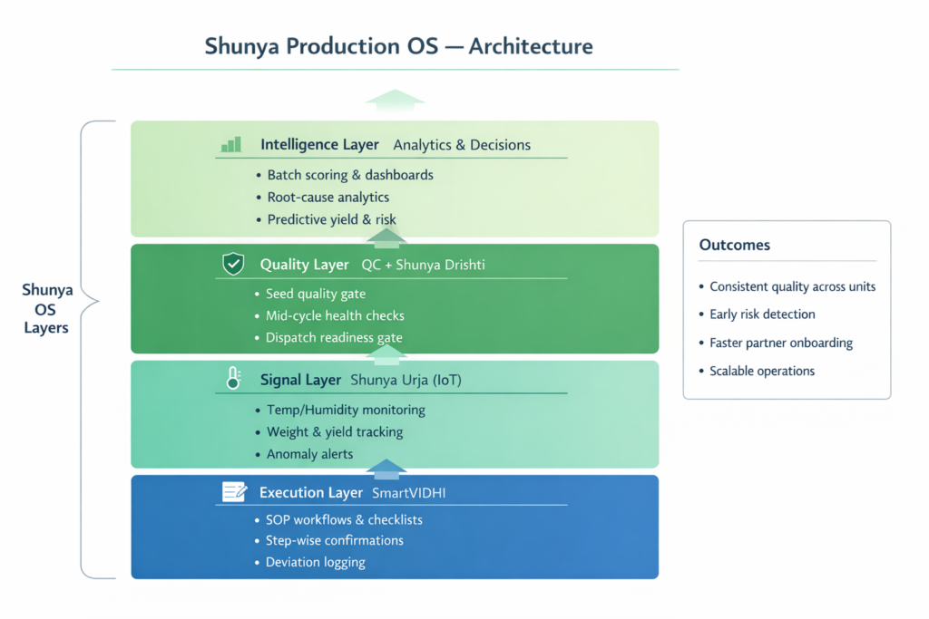 Shunya Production OS is built as a closed-loop architecture, integrating execution, sensing, quality enforcement, and intelligence.