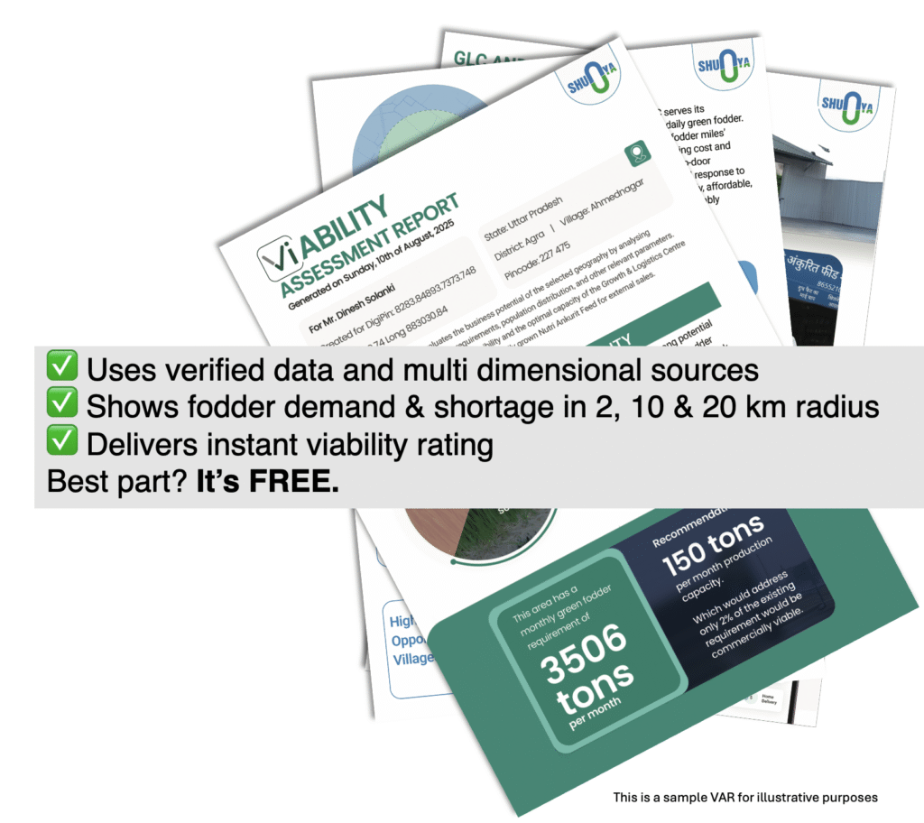 This is exactly where Shunya Agritech’s Viability Assessment Report (VAR) stands apart. With just one step – sharing a simple location pin (latitude/longitude) – a prospective fodder entrepreneur receives a 1st level viability report instantly. No long surveys. No waiting for consultants. And NO COST!